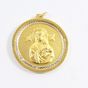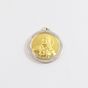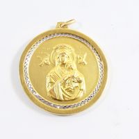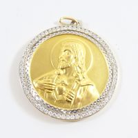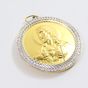 Pendentif religieux rond, double face en ors de couleur 585 mil, une face bordée d'une ligne de diamants (environ 2 ct au total) (Diam : 4,6 cm). 20,8 g brut.