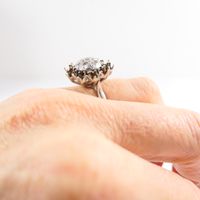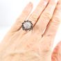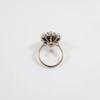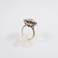 Bague "fleur " : en or gris 750 mil. centrée d'un pavage de diamants taille ancienne, les pierres de l'entourage étant manquantes (TDD : 52 ; diamètre du chaton : 1,8 cm). 7 g. brut.