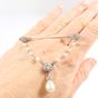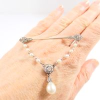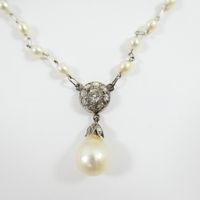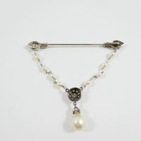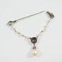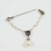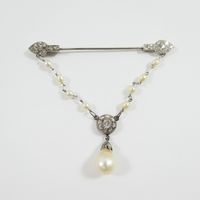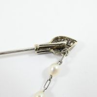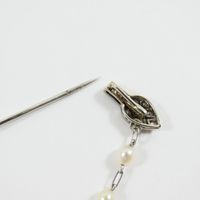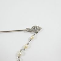 Broche barrette : en platine 850 mil. et or gris 750 mil., agrémentée d'une chaînette (perles de culture, diamant taille brillant, diamants taille 8/8 et taille ancienne) (transformations, soudures, trace de colle). 6,2 g. brut.