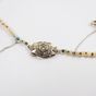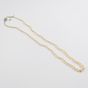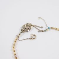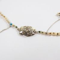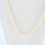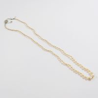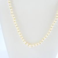 Collier d'un rang de perles de culture : en chute (diamètre des perles : 2 à 6,5 mm environ), avec fermoir et chainette de sécurité en or gris 750 mil. (diamant taille 16/16 et diamants taille 8/8) (longueur : 54 cm environ) (usures, salissures). 10 g. brut.