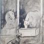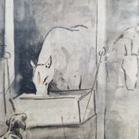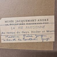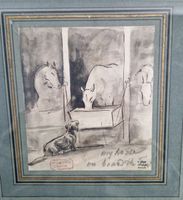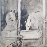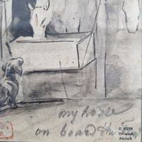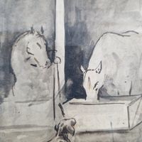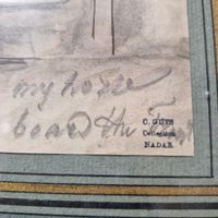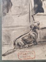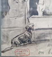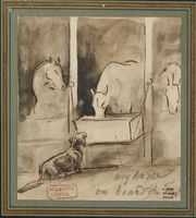 Attribué à Constantin GUYS (1802- 1892) Le cheval de Constantin Guys Encre et lavis d’encre sur papier Porte l’annotation manuscrite "My horse on board".. Porte un Cachet "C.Guys" et "Collection Nadar" en bas à droite et un cachet "Collection Nadar" en bas à gauche 14 x 12 cm (à vue) Porte au dos du carton de montage une ancienne étiquette du Musée Jacquemart André