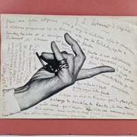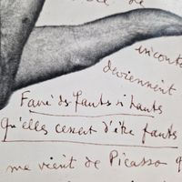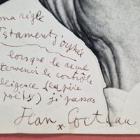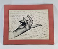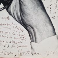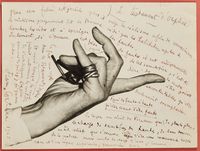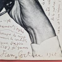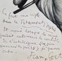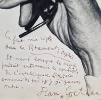Jean COCTEAU (1889 – 1963) Le testament d’Orphée Photographie représentant la main de Jean Cocteau enrichie d’un long texte manuscrit de Jean Cocteau Signée en bas à droite "Jean Cocteau 1960" 30 x 40 cm (Déchirures sur les bords, pliures, taches)