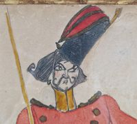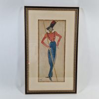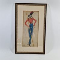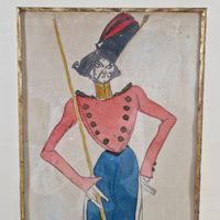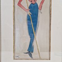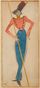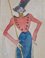 Léon BAKST (1866 – 1924) Poupée cosaque la nuit Aquarelle sur trait de crayon et rehauts d’or sur papier Signé et daté en bas à gauche "Bakst 23" 46 x 20 cm (à vue) (Déchirures, petits manques, tâches, restaurations, mouillures)