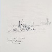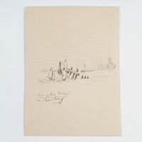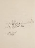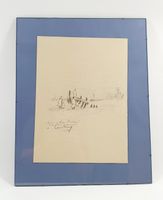 André HAMBOURG (1909-1999) : "Paysage marin à l'épave" Dessin au crayon noir . Signé, daté "Mars 1964" avec envoi à André BRISSAUD (1920-1996). Dim. 37,5 x 27,3 cm. (Sous verre : 50 x 40 cm).