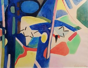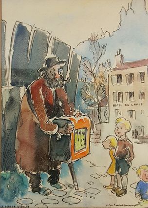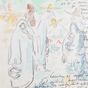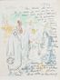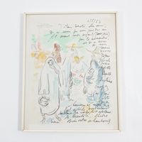 André HAMBOURG (1909-1999) : "Fantaisie marocaine" Dessin au crayon noir aquarellé et lettre autographe adressée à André BRISSAUD (1920-1996) sur papier à en-tête "La Thillaye Englesqueville-en-Auge" contrecollé sur carton. Dessin ayant servi à illustrer "La rose et le sable " de Henry de Montherlant. Signé et daté "4/5/67". Dim. : 26,5 x 21 cm. (Encadré : 30,5 x 24,5 cm). Pliure, insolé en haut à droite.