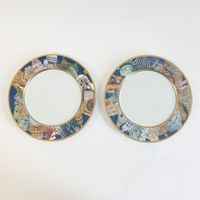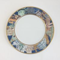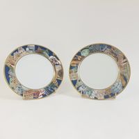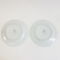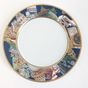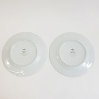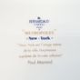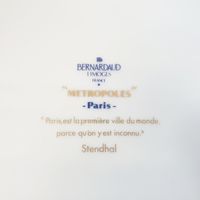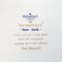 BERNARDAUD Limoges, modèle METROPOLE : 2 assiettes plates "Paris n°24 " et "New York n°32" en porcelaine blanche, polychrome et or; l'aile richement décorée de monuments emblématiques de ces 2 villes. Signatures et citations de Stendhal et Paul Morand au dos. Légers frottements à la dorure. Diam. : 26 cm