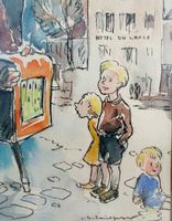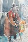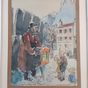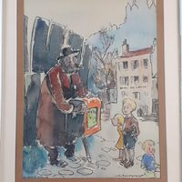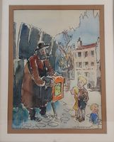 Charles SAINT-GEORGE (1907-1980) : "Le joueur d'orgue devant l'hôtel du Large" Aquarelle et encre sur papier. Signée en bas à droite et titrée. Dimensions (à vue) : 38 x 29 cm. (Encadrée : 65,5 x 55,5 cm). (Légèrement gondolé, petites rousseurs).