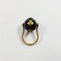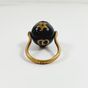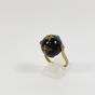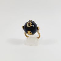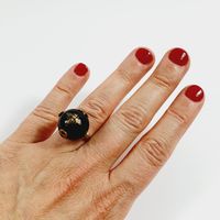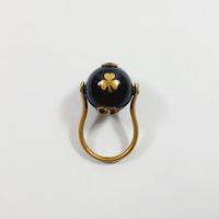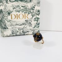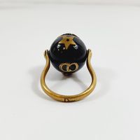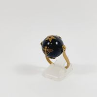 Christian DIOR, années 2010 : Bague en métal doré vieilli à sphère mobile en onyx ornée du monogramme, d'une abeille, du chiffre 8, d'une étoile et d'un trèfle. Taille M (TDD : 53). Signée. On y joint sa boîte et une breloque étoile en métal doré siglée.