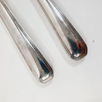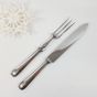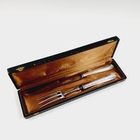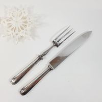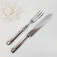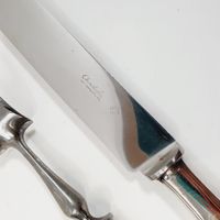 CHRISTOFLE, modèle AMERICA : Service à découper de 2 pièces en métal argenté, modèle à pans coupés et filets comprenant : - 1 couteau (lame en inox, Long. 32 cm) - 1 fourchette (fourchon en inox, Long. 27,3 cm) Signés, modèle ART DECO d'après Luc LANEL, production contemporaine. Très bon état. Avec son écrin légèrement défraichi.