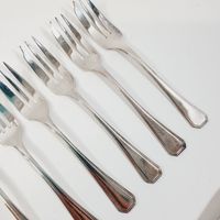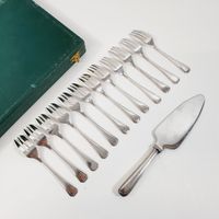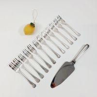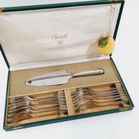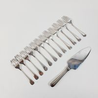 CHRISTOFLE, modèle AMERICA : Service à dessert de 13 pièces en métal argenté, modèle à pans coupés et filets comprenant : - 12 fourchettes à gâteau - 1 pelle à tarte (pelle en inox) Signés, modèle ART DECO d'après Luc LANEL, production contemporaine. Très bon état. Avec son écrin légèrement défraichi.