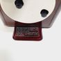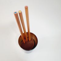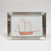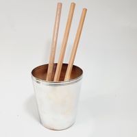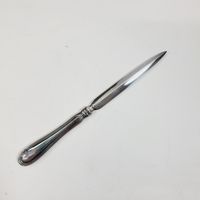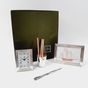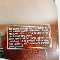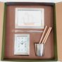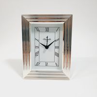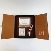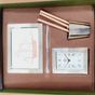 CHRISTOFLE, XXème siècle : Nécessaire de bureau de 4 pièces signées comprenant : - Pendulette rectangulaire à quartz, à baguette plate rainurée en métal argenté vernis et bois vernis, cadran blanc à heures en chiffres romains (Dim. 12,4 x 9,3 cm) (Baguette à recoller). - Cadre photo à poser, rectangulaire à baguette plate rainurée, en métal argenté vernis et bois vernis (Dim. 13 x 18 cm). - Timbale tronconique porte-crayons en métal argenté, à fond uni et bords à filets (H. 7 cm). - Coupe-papier, modèle Albi en métal argenté (Long. 19 cm). Avec son écrin d'origine et 3 crayons de couleur.