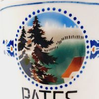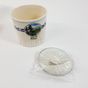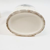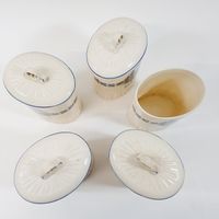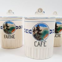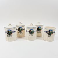Ensemble de 5 pots couverts de cuisine en faïence fine ART DECO, vers 1930 : à décor montagnard de sapins et chalets, frise florale stylisée, noms des ingrédients destinés (sucre, farine, pates, café et riz). Hauteurs semblables : 20 cm. Non signés, 1 couvercle cassé.