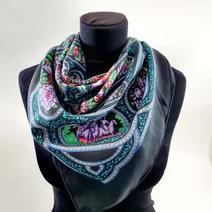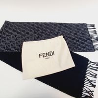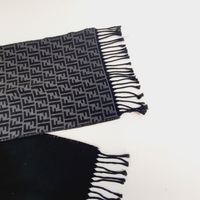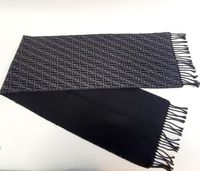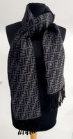 FENDI : Echarpe homme en laine à motifs Jacquard siglée FF dans les tons gris et noir, revers noir uni, bords effrangés. Fabriquée en Italie. Dim. : 30 x 180 cm. Avec son dustbag.