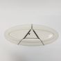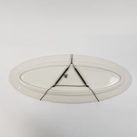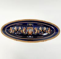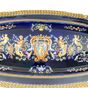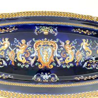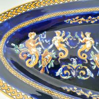 GIEN, modèle Renaissance Fond Bleu : Plat à poisson oblong en faïence fine à décor de grotesques polychromes sur fond bleu nuit. Marque sous la base. Dim. : 27 x 68 cm Avec support pour accrochage murale.