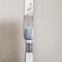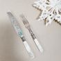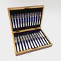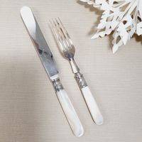 Grande-Bretagne, début du XXème siècle : Suite de 12 couteaux et 12 fourchettes à fruits ou dessert en métal argenté, les manches piriformes en nacre. Les lames et viroles à décor de fleurs et feuillages. Sans poinçon ni signature. Très bon état. Dans son coffret en bois et laiton.