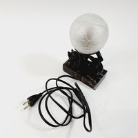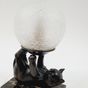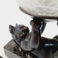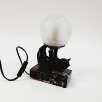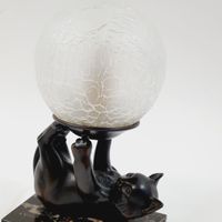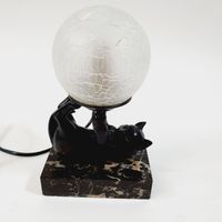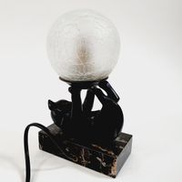 JANLE (pseudonyme de Max LE VERRIER 1891-1973) : "Chat jongleur" formant lampe. Epreuve en régule à patine brune sur socle en marbre rectangulaire et globe en verre satiné à effet craquelé. Signée sur le flan. Dim. : 21 x 13 x 7 cm Petits accidents au globe, ampoule à changer.