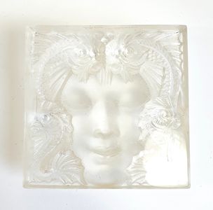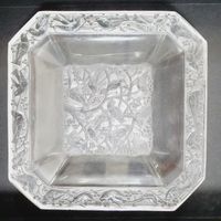 LALIQUE France, modèle ANNA : Cendrier carré à pans coupés en verre moulé-pressé partiellement satiné, à décor de mésange, branchages et baies Signé sous la base Larg. : 8,5 cm Bibliographie : MARCILHAC, Félix, Catalogue raisonné de l'oeuvre de verre, Les éditions de l'amateur, page 276, n° 303, modèle créé en 1929.