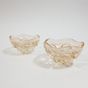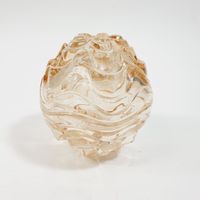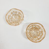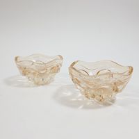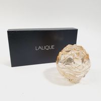 LALIQUE France, modèle VIBRATION : Boîte ovoïde en 2 parties (pouvant former 2 coupelles), en cristal transparent lustré or, signés sur le bord. H. : (boîte : 10,5 cm; coupelles : 5,3 cm), diam. : 10 cm. Avec sa boîte d'origine (légèrement abimée).
