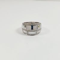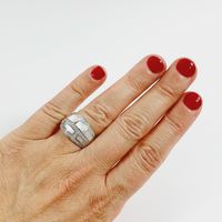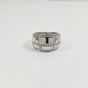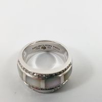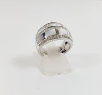MAUBOUSSIN, modèle "Belle de jour" : Bague bandeau en or gris 750 mil. sertie de plaques de nacre dans un entourage de diamants brillantés. Signée et numérotée AH1713. (TDD : 54). Légères rayures d'usage. 13 g brut.