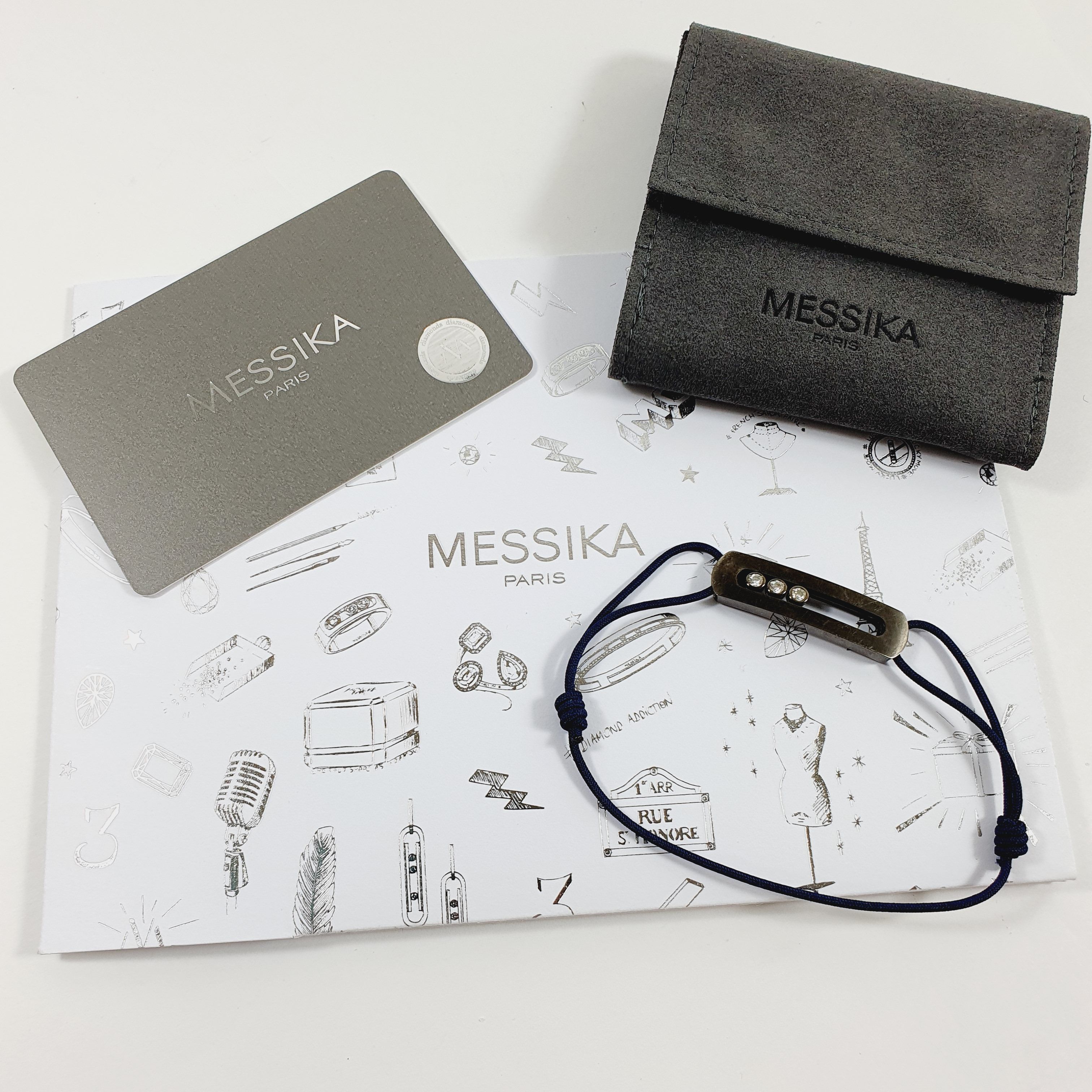 MESSIKA, modèle "Move Titanium Graphite" : Bracelet composé d'un motif oblong en titane couleur graphite centré de 3 diamants mobiles en serti clos sur cordon marine. Signé et numéroté C22948 (Dim. motif : 3,5 x 0,9 cm environ ). 3,6 g. brut. Avec pochette et certificat.