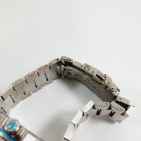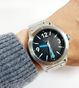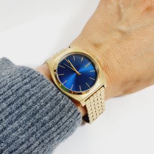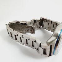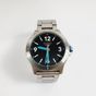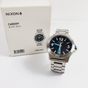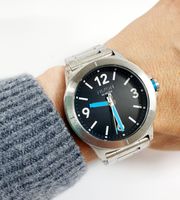 NIXON, modèle "Cardiff" : Bracelet-montre d'homme, en acier, cadran rond noir (Diam. 41 mm environ), index blancs et aiguilles bleues, mouvement à quartz japonais. Bracelet à maillons articulés et boucle déployante. Signée. Légères rayures d'usage et traces d'oxydations. Avec boîte d'origine et livret.