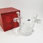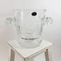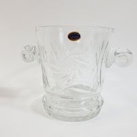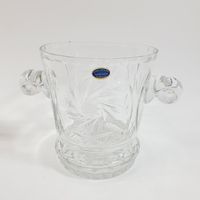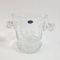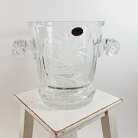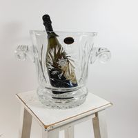 Seau à champagne vintage des années 70/80 : en cristal soufflé et taillé, à décor géométrique stylisé, les anses en enroulements. Travail de l'est de la France. H. 24 cm et diam. 22 cm Petits éclats. Dans sa boîte imitation lézard rouge un peu défraichie.