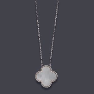 1 500 / 2 000 €VAN CLEEF & ARPELS, modèle « Magic Alhambra ». Collier articulé en or gris 750 millièmes retenant un pendentif quadrilobé, le centre orné de nacre. Signé et numéroté. (Usures) Longueur : 37,5 et 41,5 cm Hauteur pendentif : 2,5 cm Poids brut : 10,5 g