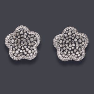 900 / 1 200 €Paire de boucles d'oreilles en or gris 750 millièmes, chacune à décor de fleur entièrement sertie de diamants ronds de taille brillant, ceux du centre plus importants dans un sertissage noirci. Système à pinces ou pour oreilles percées. Hauteur : 2 cm Poids brut : 17,9