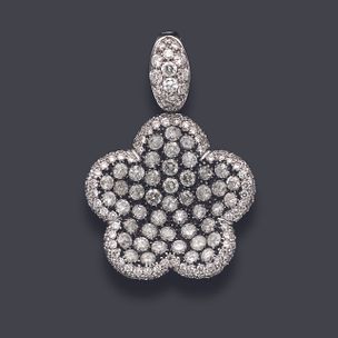 500 / 800 €Pendentif en or gris 750 millièmes figurant une fleur entièrement sertie de diamants ronds de taille brillant, ceux du centre plus importants dans un sertissage noirci. Hauteur : 4 cm Poids brut : 11,8 g