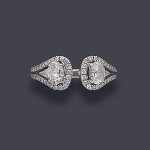 500 / 800 €MESSIKA Bague ouverte en or gris 750 millièmes, les extrémités ornées de diamants de forme ovale dans un entourage de petits diamants ronds de taille brillant. Signée. (Usures et manque deux diamants) Tour de doigt : 49 environ Poids brut : 3,4 g