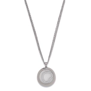1 000 / 1 500 €CHOPARD Collier de deux rangs articulés en or gris 750 millièmes retenant un pendentif rond en or gris 750 millièmes, renfermant un motif cœur mobile sous verre orné de diamants ronds de taille brillant. (Usures) Signé sur chaque élément. Numéroté sur le pendentif. Longueur : 43,5 cm environ Hauteur du pendentif : 3 cm Poids brut : 19,7 g