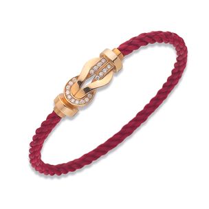 1 200 / 1 800 €FRED, modèle « Chance infinie », T. 19. Bracelet souple en composition rouge figurant une torsade, le fermoir amovible en or jaune 750 millièmes à décor de nœud orné de diamants ronds de taille brillant. (Usures) Signé et numéroté. Longueur : 20,5 cm Poids brut : 10,7 g Écrin.