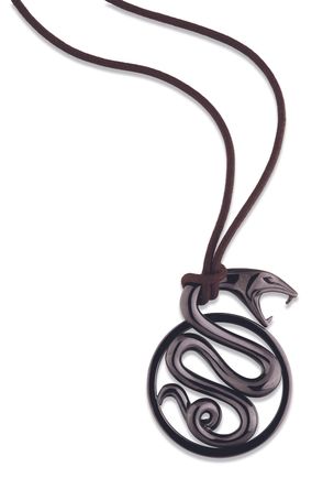 200 / 300 €BOUCHERON, modèle «Trouble ». Pendentif en argent 800 millièmes teinté marron figurant un serpent. Signé et numéroté. Hauteur : 6 cm Poids brut : 33,3 g On y joint un collier cordonnet.