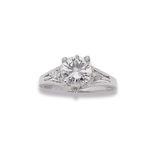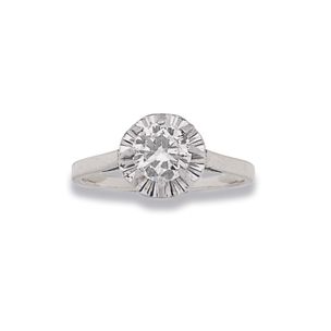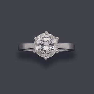 5 000 / 8 000 €Bague en platine 850 millièmes ornée d'un diamant rond de taille brillant entre six griffes. (Usures) Tour de doigt : 53 Poids brut : 7,1 g Accompagnée d'une attestation diamant du CCIP n°135327 du 16/04/1999 précisant : - Masse : 2,32 ct - Couleur : H - Pureté : SI1 - Fluorescence : Faible - Dimensions : 8,76 - 8,91 x 5,01 mm