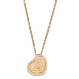1 000 / 1 500 €CHOPARD, modèle « Happy Spirit ». Collier de deux rangs articulés en or jaune 750 millièmes retenant en pendentif un motif cœur en or jaune 750 millièmes renfermant au centre deux cœurs et un diamant rond de taille brillant mobile sous verre. Signé sur les deux éléments. Numéroté sur le pendentif. (Usures) Longueur : 59 cm Hauteur du pendentif : 2,7 cm Poids brut : 28,2 g