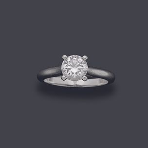 3 000 / 4 000 €CARTIER Bague en platine 950 millièmes ornée au centre d'un diamant rond de taille brillant entre quatre griffes. Signée et numérotée. Tour de doigt : 50 Poids brut : 4,8 g Accompagnée d'un rapport diamant du GIA no 2121674922 du 26/10/2010 précisant : - Masse : 1,01 ct - Couleur : D - Pureté : VVS2 - Fluorescence : Aucune - Dimensions : 6,46 - 6,49 × 3,90 mm et d'un certificat de la Maison CARTIER.