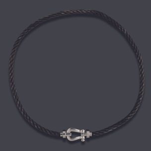 700 / 1 200 €FRED, modèle « Force 10 », T.18. Bracelet double en acier figurant un câble, le fermoir amovible représentant une manille en or gris 750 millièmes. (Usures) Signé sur les deux éléments. Numéroté sur le fermoir. Longueur : 39 cm Poids brut : 26,2 g
