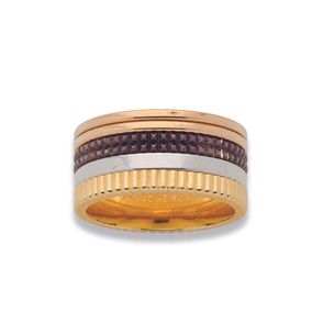 1 500 / 2 000 €BOUCHERON, modèle « Quatre ». Bague bandeau en or 750 millièmes de plusieurs tons figurant quatre anneaux, certains gravés en PVD marron. Signée et numérotée. (Usures) Tour de doigt : 63 environ Poids brut : 22,3 g Avec un écrin, une boîte et un certificat d'authenticité de la Maison BOUCHERON.