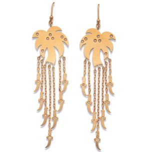 800 / 1 500 €MOUAWAD Paire de pendants d'oreilles en or jaune 750 millièmes, chacun décoré d'un palmier serti de diamants ronds retenant des sabres en pampille. (Usures) Signés sur chaque. Hauteur : 8 cm Poids brut : 17,3 g
