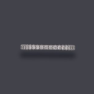 400 / 600 €CARTIER Alliance américaine en or gris 750 millièmes entièrement sertie de diamants ronds de taille brillant. (Usures) Signée et numérotée. Tour de doigt : 52 Poids brut : 1,6 g Avec un écrin de la Maison CARTIER.