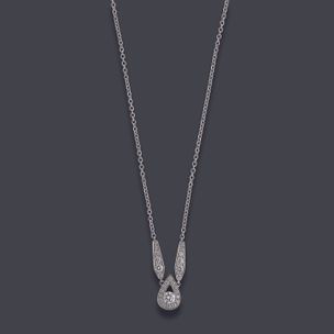 800 / 1 200 €CHAUMET Collier articulé en or gris 750 millièmes retenant au centre un motif orné de diamants ronds de taille brillant, un plus important. Signé et numéroté. Longueur : 38 à 41,5 cm Poids brut : 6,9 g Avec un écrin de la Maison CHAUMET.