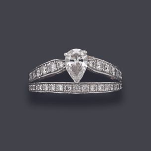 CHAUMET, modèle « Joséphine ». Bague en or gris 750 millièmes figurant deux anneaux ornés de diamants ronds de taille brillant, le centre serti d'un diamant poire. (Usures) Signée. Tour de doigt : 54 Poids brut : 5,5 g Accompagnée d'un rapport diamant du GIA no 1228237524 du 04/05/2016 précisant : - Masse : 0,71 ct - Couleur : D - Pureté : VVS2 - Fluorescence : Aucune - Dimensions : 7,64 × 5,08 × 3,13 mm et d'un certificat d'authenticité de la Maison CHAUMET.