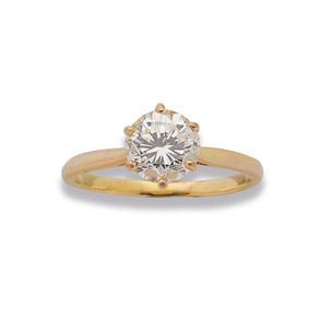 4 500 / 5 500 €Bague en or jaune 750 millièmes ornée d'un diamant rond de taille brillant. (Usures) Tour de doigt : 60,5 Poids brut : 3,2 g Accompagnée d'un rapport de CGL no 34149 du 13/09/2025 précisant : - Masse : 2,16 ct - Couleur : J - Pureté : VS2 - Fluorescence : « Faint » - Dimensions : 8,07 - 8,13 × 5,35 mm