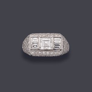 500 / 800 €Bague en or gris 750 millièmes ornée au centre de cinq diamants rectangulaires, un plus important, dans un pavage de diamants ronds taillés en huit-huit. (Usures) Tour de doigt : 54,5 Poids brut : 10,2 g