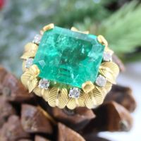Bague en or 750 millièmes et platine 850 millièmes, ornée au centre d'une émeraude de forme rectangulaire à pans coupés dans un entourage feuillagé partiellement serti de petits diamants ronds de taille brillant. Tour de doigt : 53 environ Poids brut : 28,7 g Accompagnée d'un rapport de CGL n°34168 du 13/09/2025 précisant : - Masse : 13,90 ct - Couleur : Vert intense - Provenance : Colombie - Imprégnation mineure constatée (huile) - Dimensions : 14,78 x 13,18 x 10,25 mm