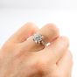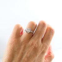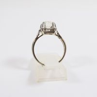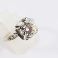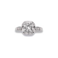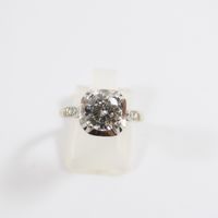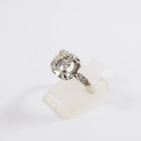 Bague en or gris 750 millièmes et platine 850 millièmes sertie d’un diamant rond de taille brillant entre des petits diamants ronds taillés en huit-huit. (Usures) Tour de doigt : 52. Poids brut : 3,1 g Accompagnée d’un rapport de CGL no 34160 du 13/09/2025 précisant : Masse : 1,19 ct. Couleur : K. Pureté : SI1. Fluorescence : « Faint ». Dimensions : 6,97 - 7,04 × 3,97 mm