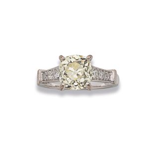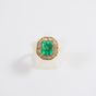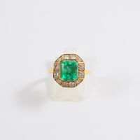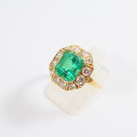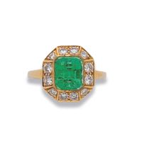 Bague en or jaune 750 millièmes ornée au centre d’une émeraude rectangulaire à pans coupés dans un entourage de diamants ronds de taille brillant. (Égrisures) Tour de doigt : 52 Poids brut : 4,5 g Accompagnée d’un rapport de CGL no 34171 du 13/09/2025 précisant : - Masse : 1,79 ct - Couleur : Vert intense - Provenance : Colombie - Imprégnation mineure constatée (huile) - Dimensions : 7,83 × 6,81 × 5,54 mm