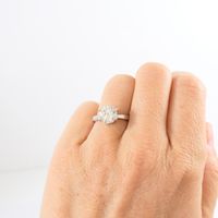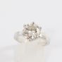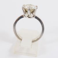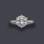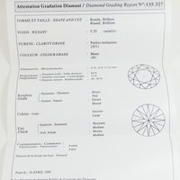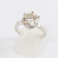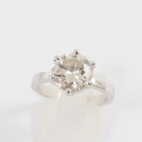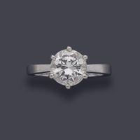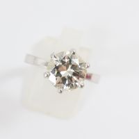 Bague en platine 850 millièmes ornée d’un diamant rond de taille brillant entre six griffes. (Usures) Tour de doigt : 53 Poids brut : 7,1 g Accompagnée d'une attestation diamant du CCIP n°135327 du 16/04/1999 précisant : - Masse : 2,32 ct - Couleur : H - Pureté : SI1 - Fluorescence : Faible - Dimensions : 8,76 - 8,91 x 5,01 mm