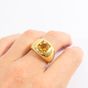 BOUCHERON, modèle « Atome ». Bague en or jaune 750 millièmes, le centre de forme bombée orné d’une citrine sertie clos. (Usures) Signée et numérotée. Tour de doigt : 56 Poids brut : 13,4 g Accompagnée d’une facture de la Maison BOUCHERON.