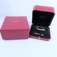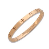 CARTIER, modèle « Love », T.18. Bracelet rigide et ouvrant en or rose 750 millièmes décoré de motifs vis. (Usures) Signé et numéroté. Diamètre intérieur : 5,8 cm Poids : 33,4 g Avec un tournevis et un écrin de la Maison CARTIER.